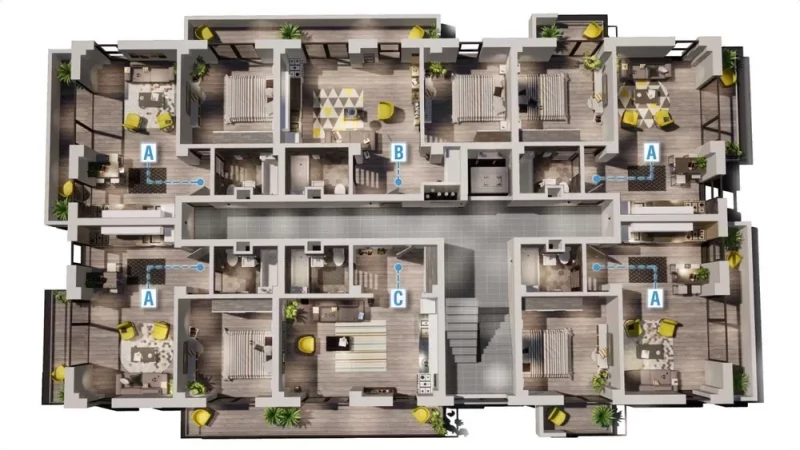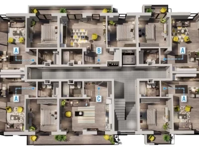 Imobilul dispune de 36 unitati locative (cate 5 studiouri de 2 camere si o garsoniera pe fiecare etaj), lift, subsol tehnic si locuri de parcare supraterane.