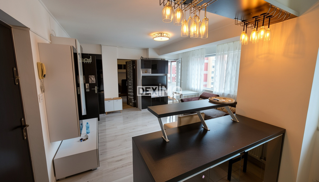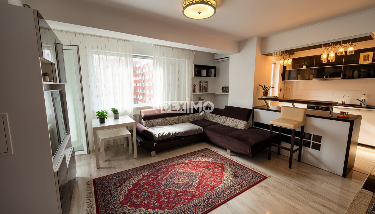 Deximo va prezinta spre inchiriere un apartament modern in suprafata de 50 mp, de 2 camere semidecomandate, situat in Zona Compozitori, la etajul 4 al unui bloc de 9 etaje cu lift, compartimentat astfel : living cu bucatarie open space, dormitor, grup sanitar si balcon. La interior, dispune de finisaje moderne, se inchiriaza mobilat si utilat complet dupa cum se poate vedea in fotografii, iar incalzirea se face prin centrala pe gaze a blocului.