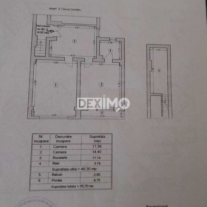 Deximo va prezinta spre vanzare un apartament clasic in suprafata de 55 mp , de 2 camere semidecomandate, situat Ultracentral, la etajul 1 al unui bloc de 2 etaje, compartimentat astfel : living, hol, bucatarie, dormitor, grup sanitar, dispune de finisaje clasice si se vinde liber ceea ce ofera posibilitatea viitorului proprietar de a-l amenaja dupa bunul plac si buget, dotat cu centrala pe gaze. In pretul imobilului intra si o boxa aflata in proprietate.