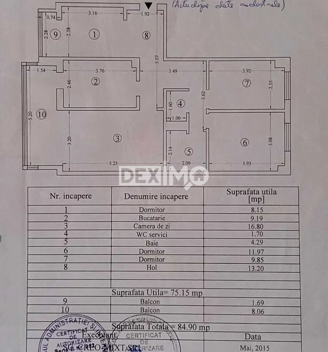 Deximo va prezinta spre vanzare un apartament modern si spatios in suprafata de 85 mp, de 4 camere decomandate, situat in Zona Dacia, la ultimul etaj al unui bloc de 4 etaje, compartimentat astfel : living, hol, bucatarie, 3 dormitoare ( unul transformat in dressing), 2 grupuri sanitare, 2 balcoane. La interior a fost recent renovat, dispune de finisaje moderne, se vinde mobilat si utilat complet dupa cum se poate vedea in fotografii, dotat cu aparat de aer conditionat, iar conducta de gaze naturale se afla la usa.