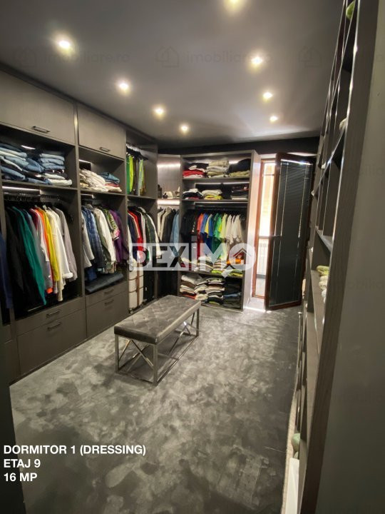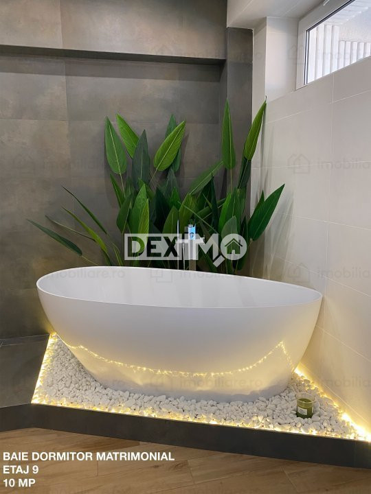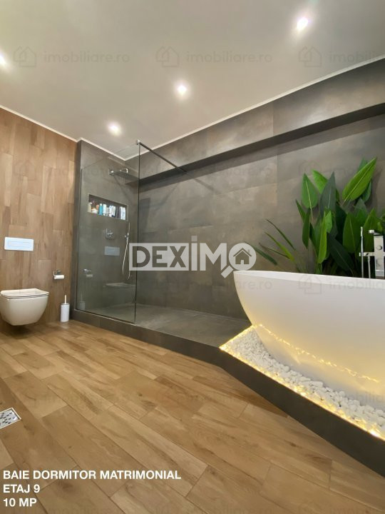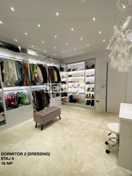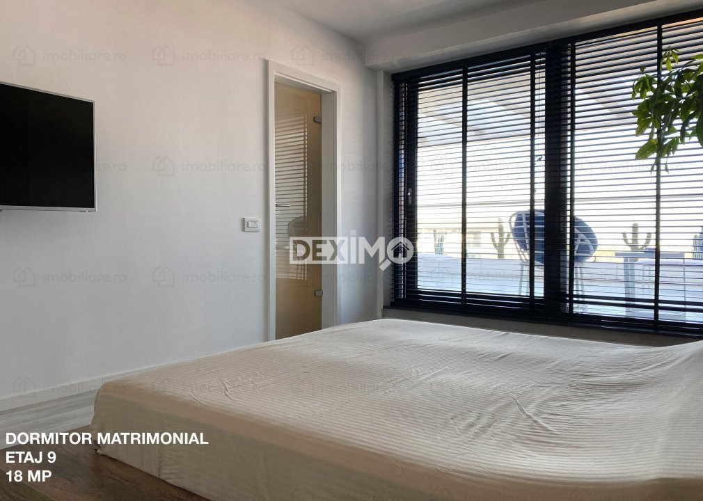 ETAJ 9 : Dormitor Matrimonial cu grup sanitar propriu, 2 Dormitoare, Grup sanitar de serviciu, Hol, Terasa cu Jacuzzi, Spatiu depozitare (balcon inchis), dispune de finisaje premium si se vinde mobilat si utilat complet dupa cum se poate vedea in fotografii, dotat cu centrala pe gaze.