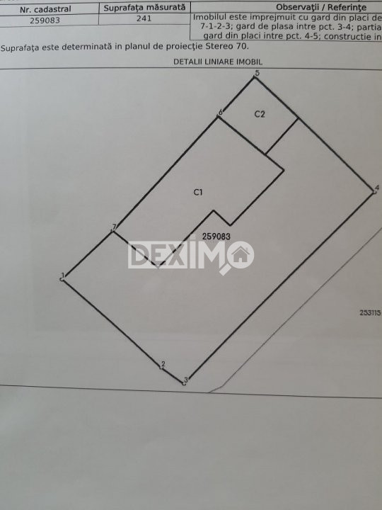 Deximo va prezinta spre vanzare o casa batraneasca, situata in Palazu Mare, amplasata pe un teren in suprafata de 284 (241 mp pe cadastru iar 43 mp vor fi in proprietate dati ulterior in urma sistematizarii strazilor) cu 2 fronturi stradale de 12 ml si 23 ml, deschidere pe colt. Constructia a fost edificata in anii 1970 din chirpic, are o suprafata construita de 58 mp si o anexa de 15 mp. Locuinta poate fi renovata sau demolata dupa bunul plac si buget al viitorului cumparator, curentul electric si conducta de apa se afla pe teren iar gazele si canalizarea se afla la strada.