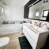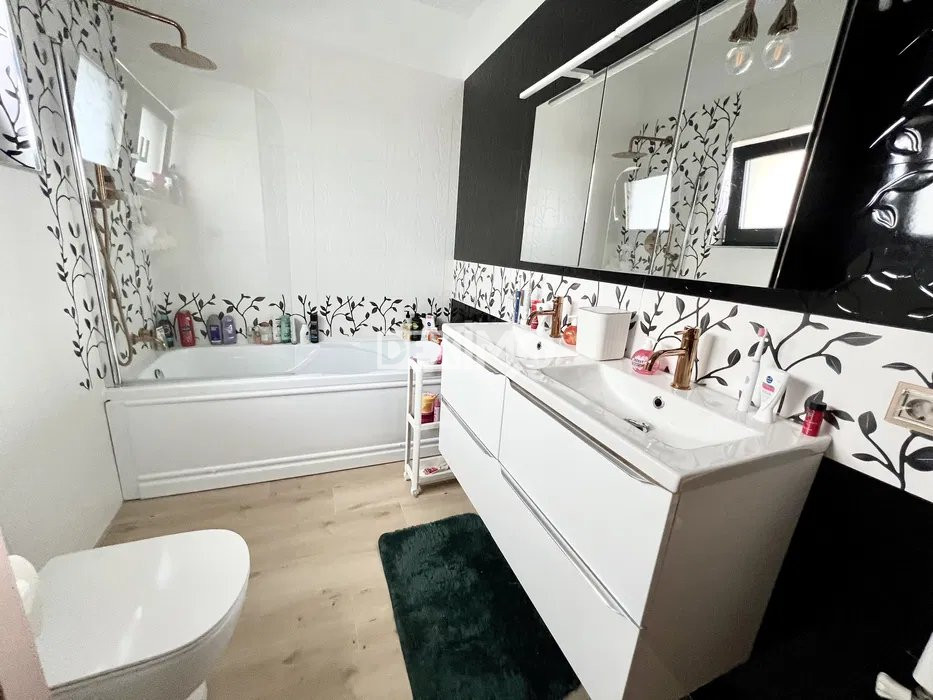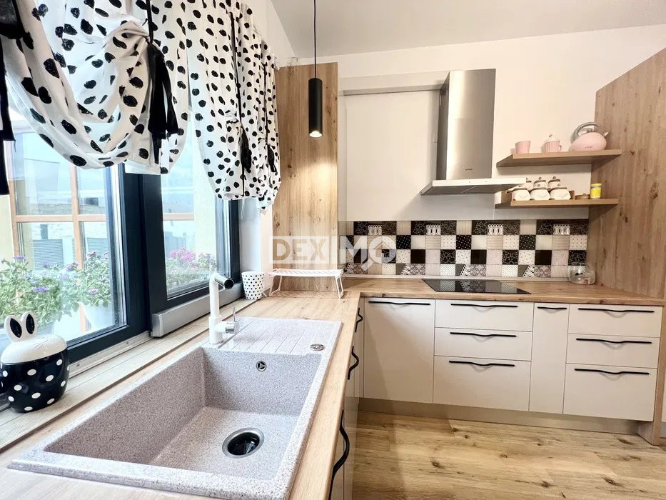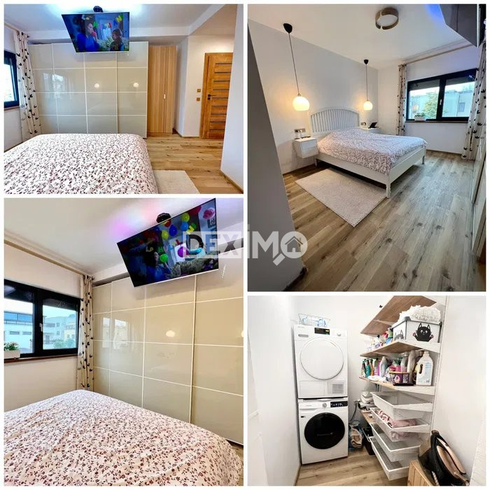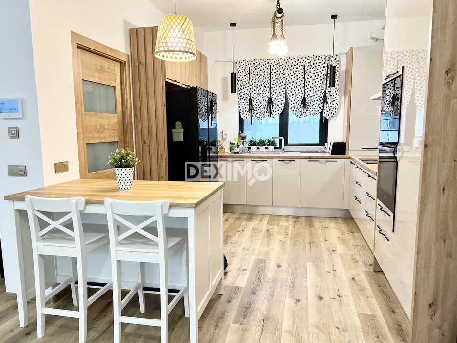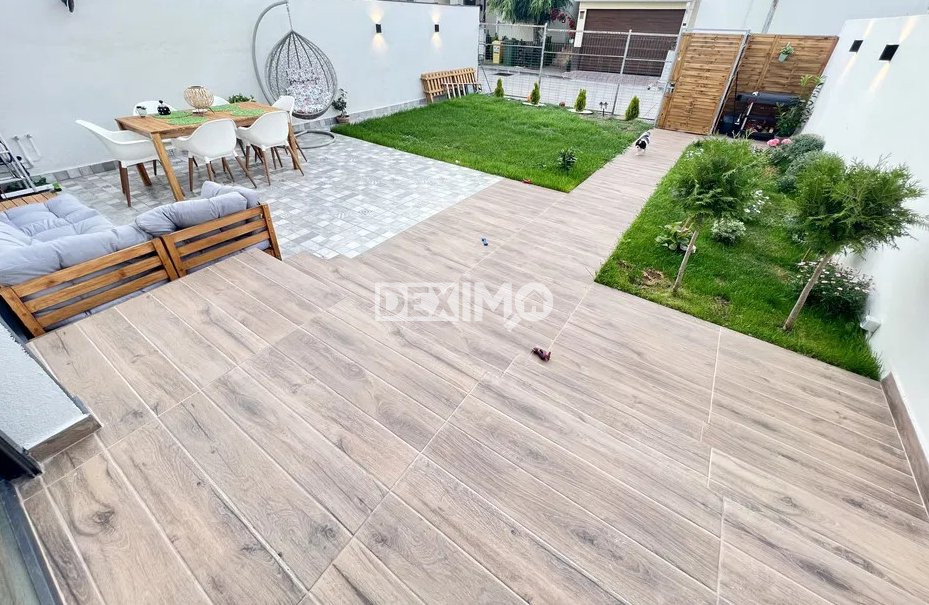 Deximo va prezinta spre vanzare, o vila P+1 dintr-un complex de vile insiruite, situata in Tomis Plus, amplasata pe un teren in suprafata de 180 mp cu un front stradal de 8ml. Constructia a fost edificata in 2009 din BCA, are o suprafata utila de 90 mp, compartimentata astfel : living cu bucatarie open space, 2 dormitoare, 2 grupuri sanitare cu fereastra, camera separata spalatorie si uscator. La interior, dispune de finisaje Premium ( pardoseala LVT, intrerupatoare touch, usi interior Porta Doors, semineu etc.)se vinde mobilata si utilata complet, dotata cu centrala noua pe Gaze Valliant si incalzire in pardoseala Purmo cu termostate Smart. La exterior este doatata cu rulouri de aluminiu si are instalatia pregatita pentru foisor.