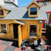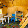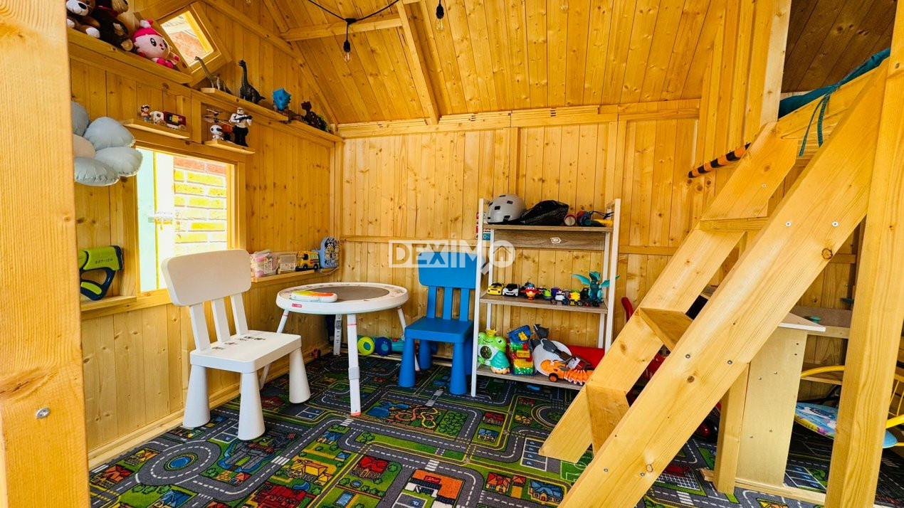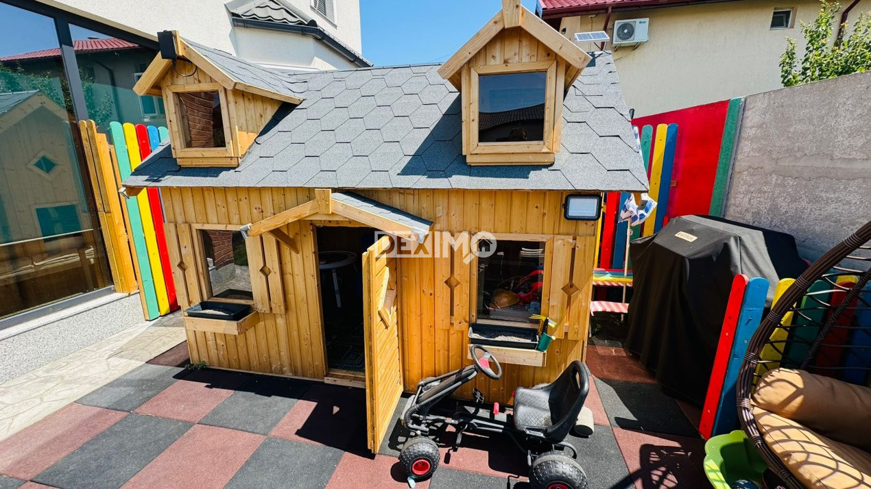 Loc de joacă amenajat pentru copii, cu pavele de cauciuc, leagăne, tobogane și o căsuță de joacă de 6 mp.