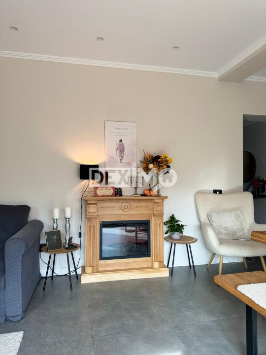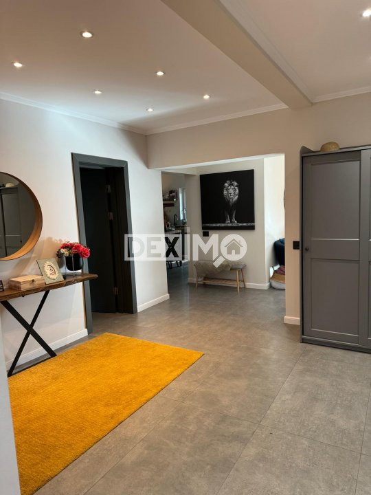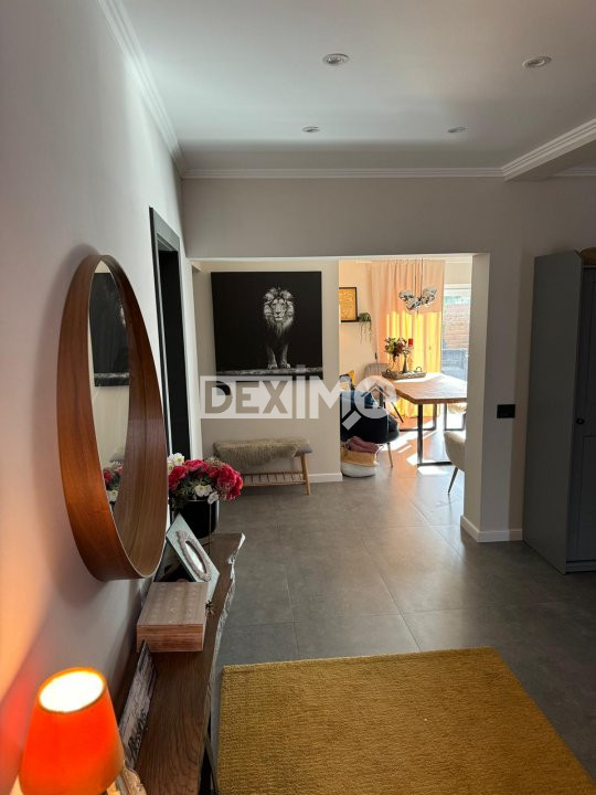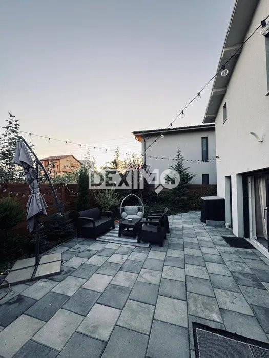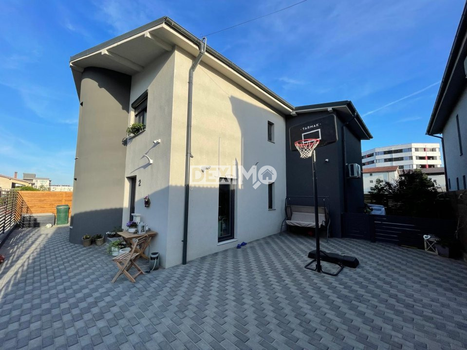 Proprietatea beneficiaza de o curte spatioasa pavata, amenajata cu spatii verzi, copaci ornamentali si loc de relaxare.