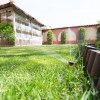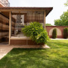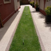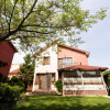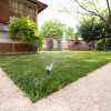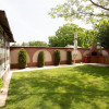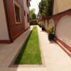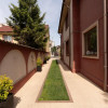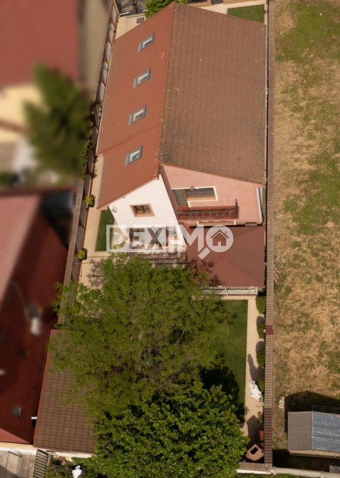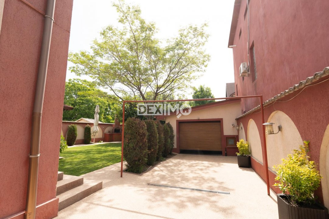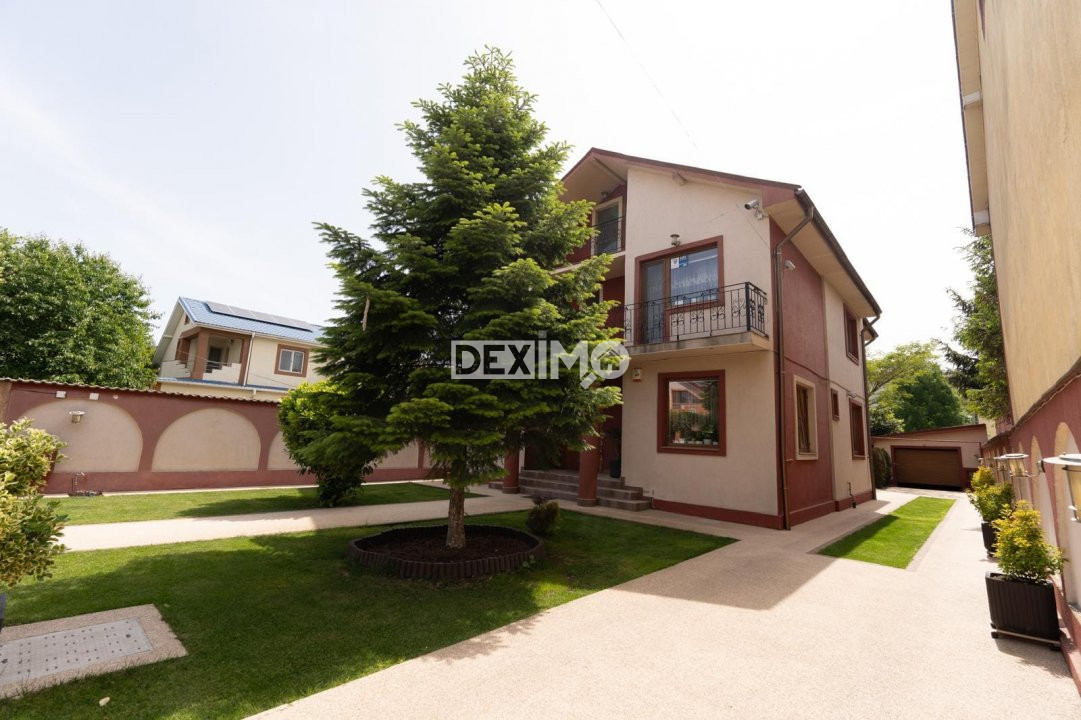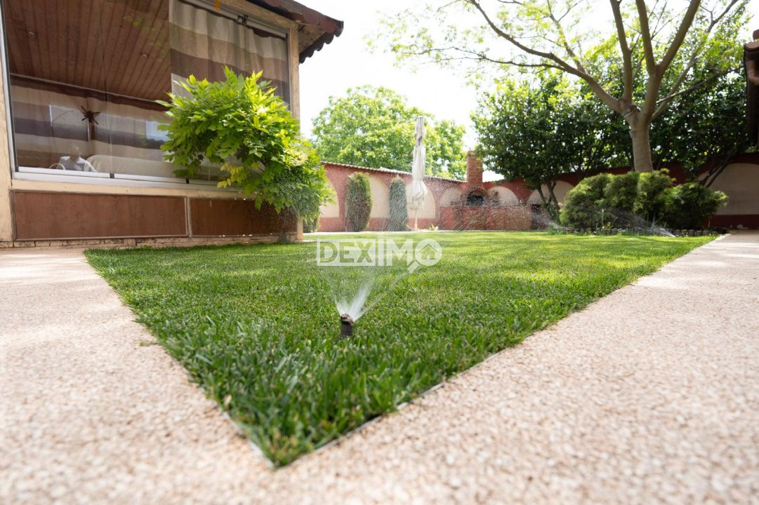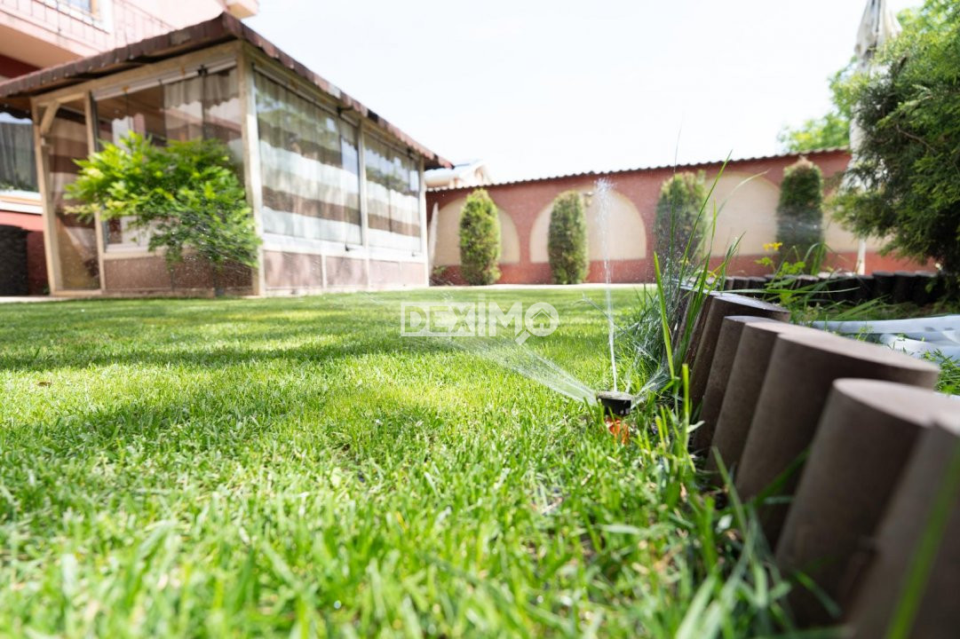 Locuinta beneficiaza de o curte generoasa, amenajata cu trotuare betonate, pomi decorativi, spatii verzi ingrijite cu sistem de irigatii automatizat, alee auto si garaj.